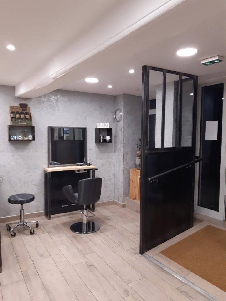 En plus d’un mobilier écolo et recyclable, Marykev’Coiffure dispose d’un seuil d’entrée en inclinaison pour personnes à mobilité réduite.